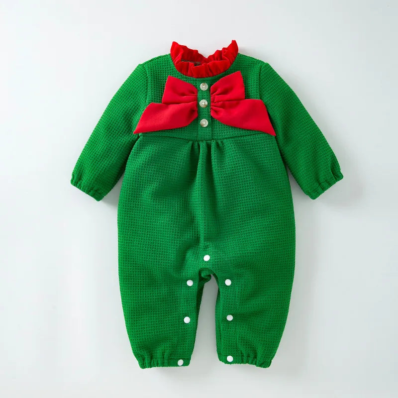 This Christmas, dress your little one in style with our Christmas Ribbon Romper. Made with a festive ruffle neck design and accented with a darling ribbon, this romper is both adorable and comfortable. Bring some holiday cheer to any occasion with this charming romper.